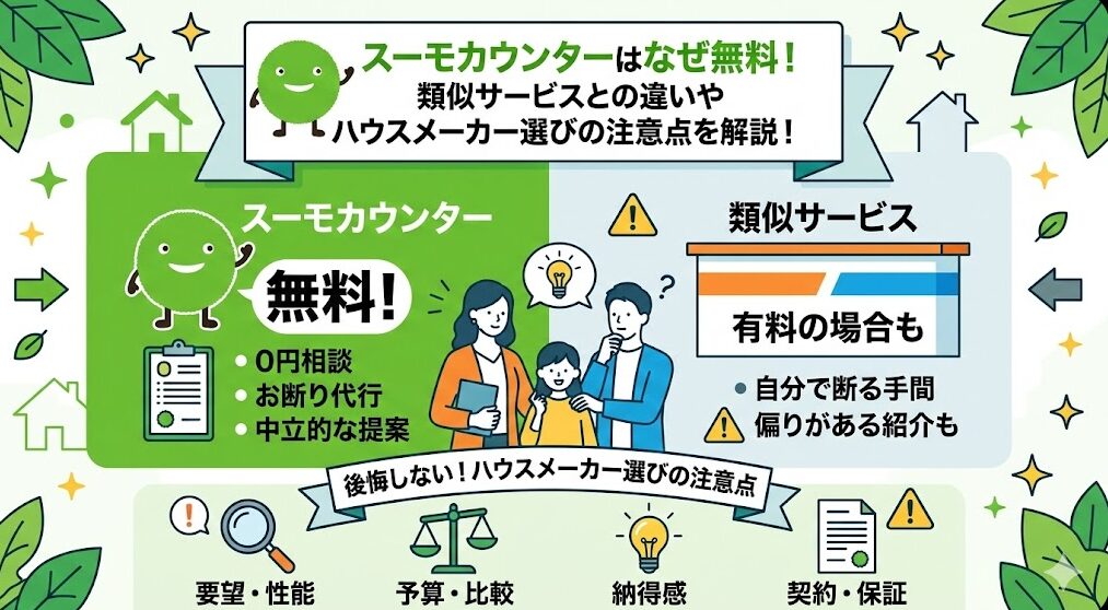 スーモカウンターはなぜ無料!類似サービスとの違いやハウスメーカー選びの注意点を解説!