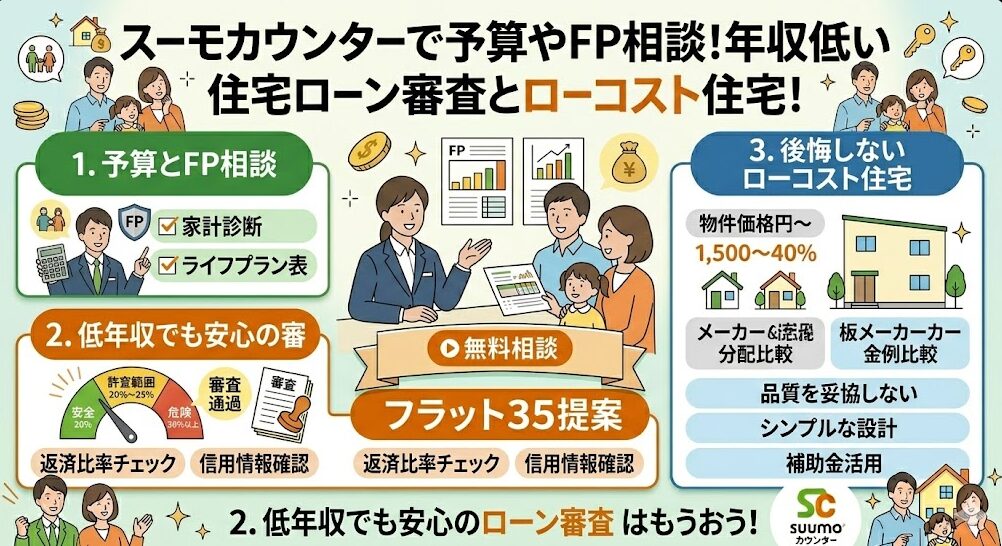 年収が低くてもマイホームは諦めなくてOK!スーモカウンターの無料相談やFP相談で、無理のない予算出し、ローン審査対策、ローコスト住宅選びをプロが伝授。2026年最新の補助金も賢く活用し、お金の不安を解消して理想の家づくりを始めましょう! -