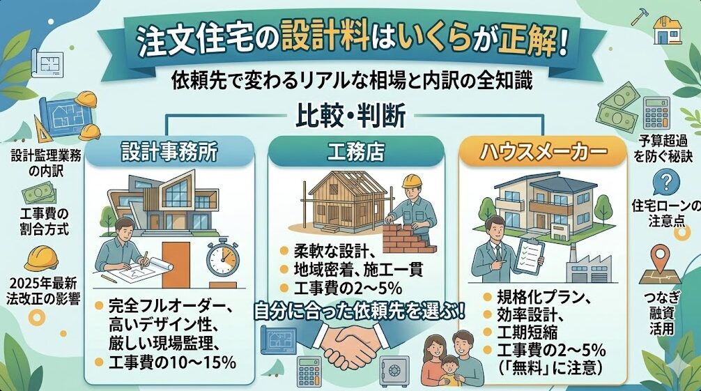 注文住宅の設計料相場はハウスメーカー2〜5%、設計事務所10〜15%が目安。図面代だけでない「監理料」の内訳や2025年法改正の注意点、支払い時期まで徹底解説!予算オーバーを防ぎ、最適な依頼先を自信を持って選ぶための判断基準を凝縮しました。 -