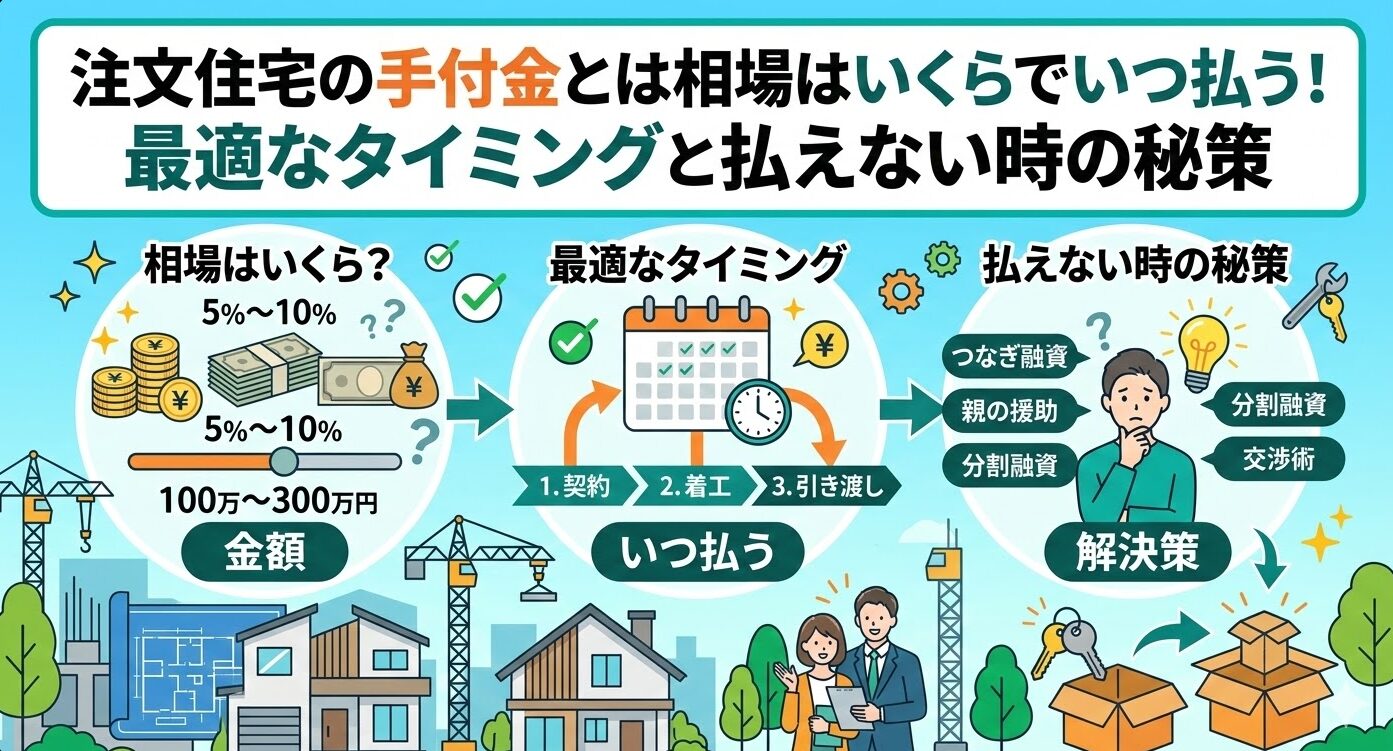 注文住宅の手付金相場は建築費の5〜10%で、契約時に現金で支払います。用意できない場合も減額交渉やつなぎ融資で対応可能。支払うタイミングや頭金との違い、返金ルールまで分かりやすく解説。納得の家づくりを始めるための必須知識を凝縮しました。 -