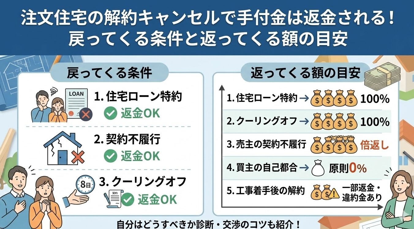注文住宅の解約で手付金が返金されるかは「理由」と「時期」で決まります。ローン特約やクーリングオフ、売主都合なら全額戻りますが、自己都合は原則没収です。履行の着手という期限に注意し、損をしないための判断基準と返金額の目安を解説します。 -