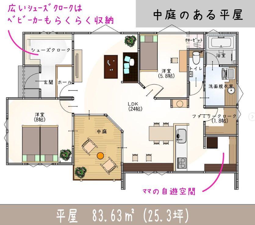 プチこの字平屋(中庭付き)66.3~93.0万円/坪平屋の弱点対策採光とプライバシー両立平屋特化/暮らしやすさ耐震等級3自由設計平屋でも明るい実用4.2