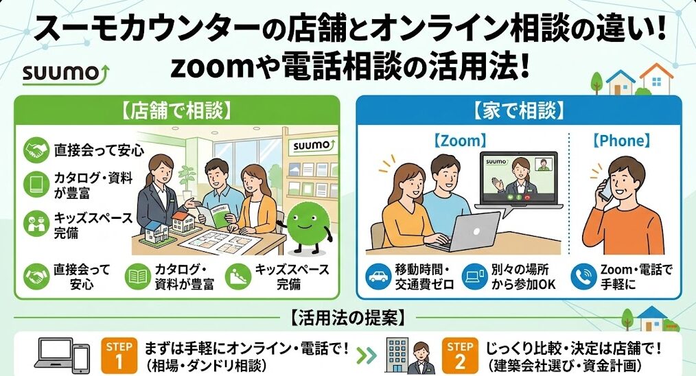 スーモカウンターの店舗・オンライン・電話相談の違いを解説!じっくり図面を見るなら店舗、自宅から手軽に話すならオンライン、すぐ相場を知るなら電話が最適。自分の状況に合った窓口を賢く選んで、失敗しない家づくりの第一歩を踏み出しましょう。 -