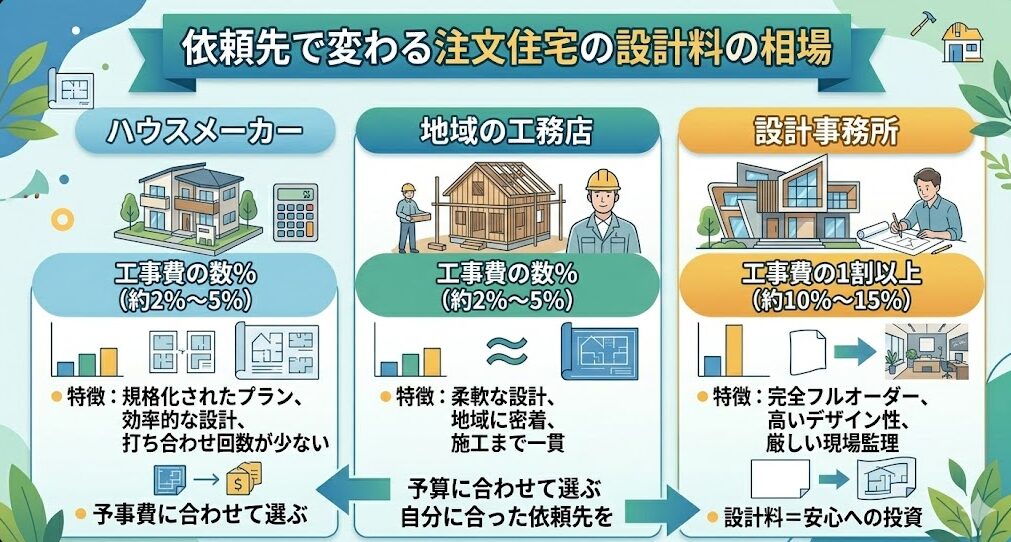 注文住宅の設計料は、ハウスメーカー、工務店、設計事務所といった依頼先によって相場が大きく変わります。