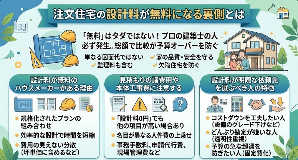 無料の理由の裏側は、設計業務にかかる費用が本体工事費や諸費用といった別の見積もり項目に分散して上乗せされているケースがほとんどです。