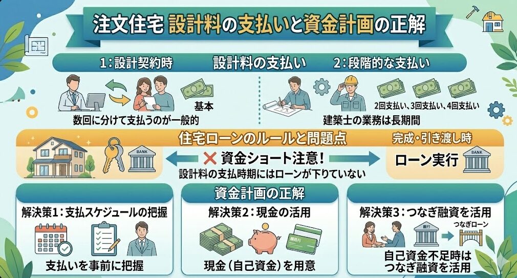 - 住宅ローンの実行は引き渡し時のため、設計料の支払いに間に合わない