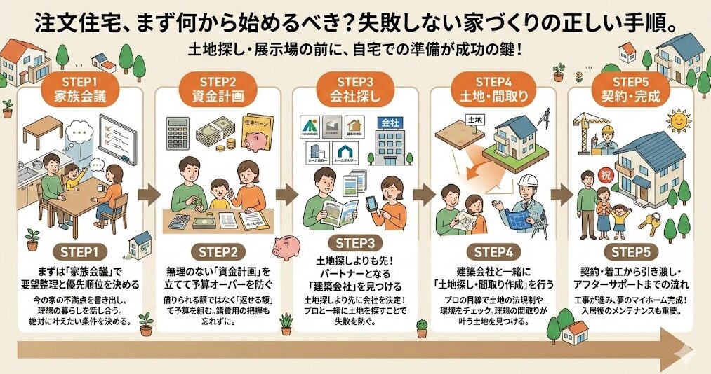 いきなり住宅展示場へ足を運ぶのではなく、まずはご自宅での「家族会議」で要望を整理し、無理のない資金計画を立ててから建築会社を探す順番で進めるのが、失敗しにくい進め方です。