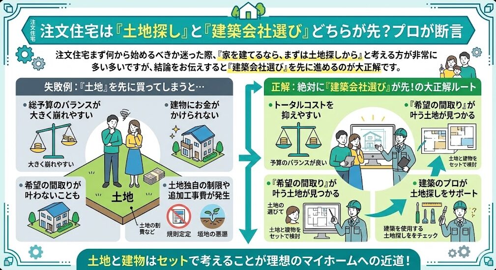 先に土地を買ってしまうと、地盤改良工事などで想定外の諸費用がかさみ、肝心の建物に予算をかけられなくなるケースがよくあります。