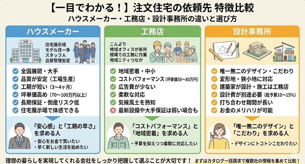 - ハウスメーカーは、建物の品質の安定感と工期の早さを求めるご家庭に向いている