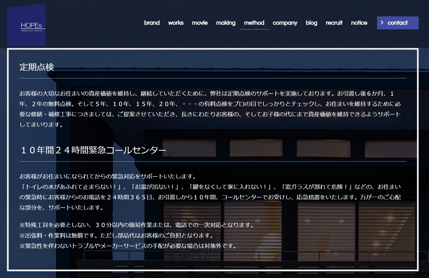 A:ホープスは「永代家守り」を掲げ、引き渡し後も24時間対応のコールセンターや定期点検を実施しており、サポートへの不満は極めて少ないのが現状です