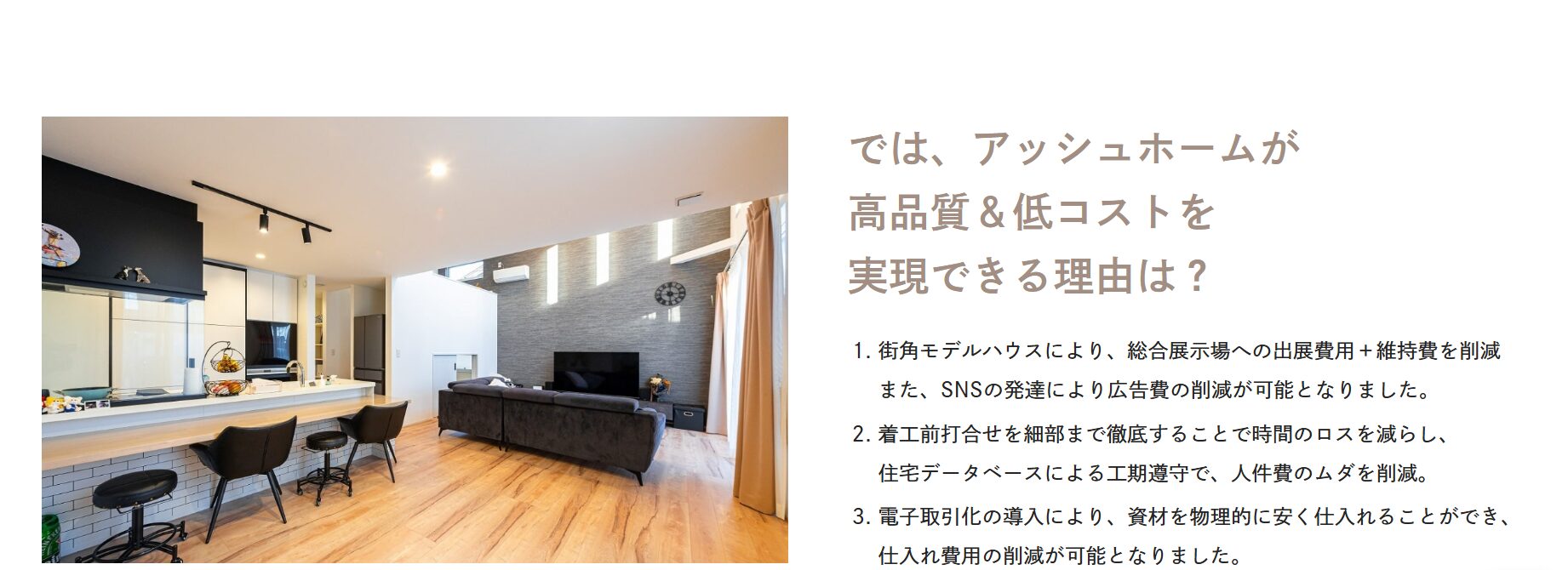 アッシュホームは、価格と住み心地のバランスを重視する人に向きます。