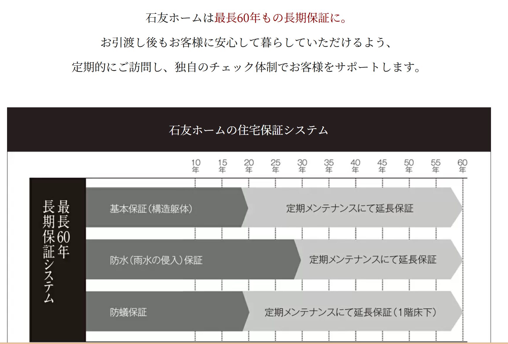 最長30年の長期保証は、一生に一度の大きな買い物において、将来の修繕リスクを最小限に抑える強力な後ろ盾となります。