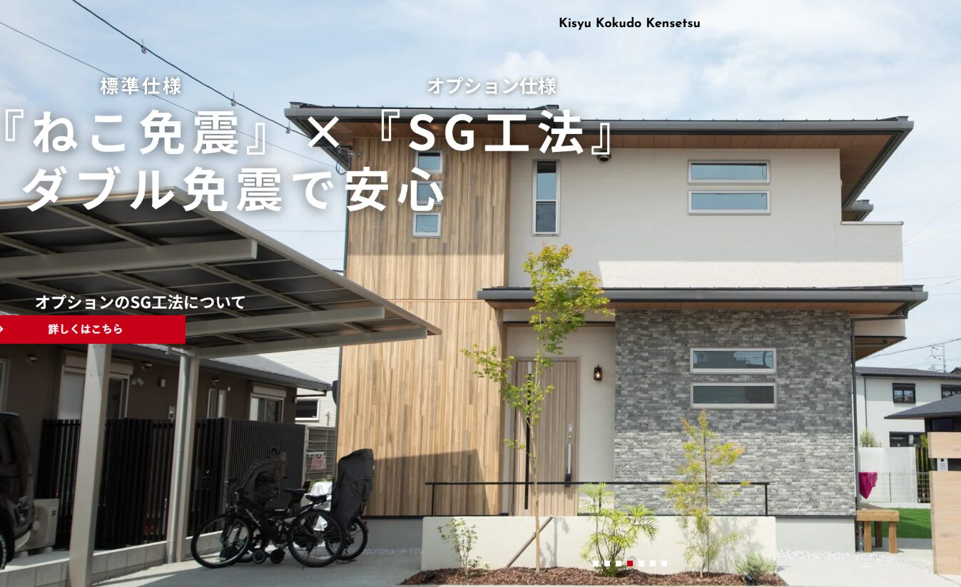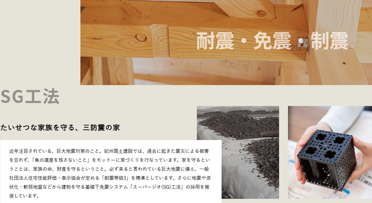 紀州国土建設は、完全自由設計と自然素材を軸にしつつ、免震SG工法や耐震等級3の標準仕様まで備えた住宅会社です。