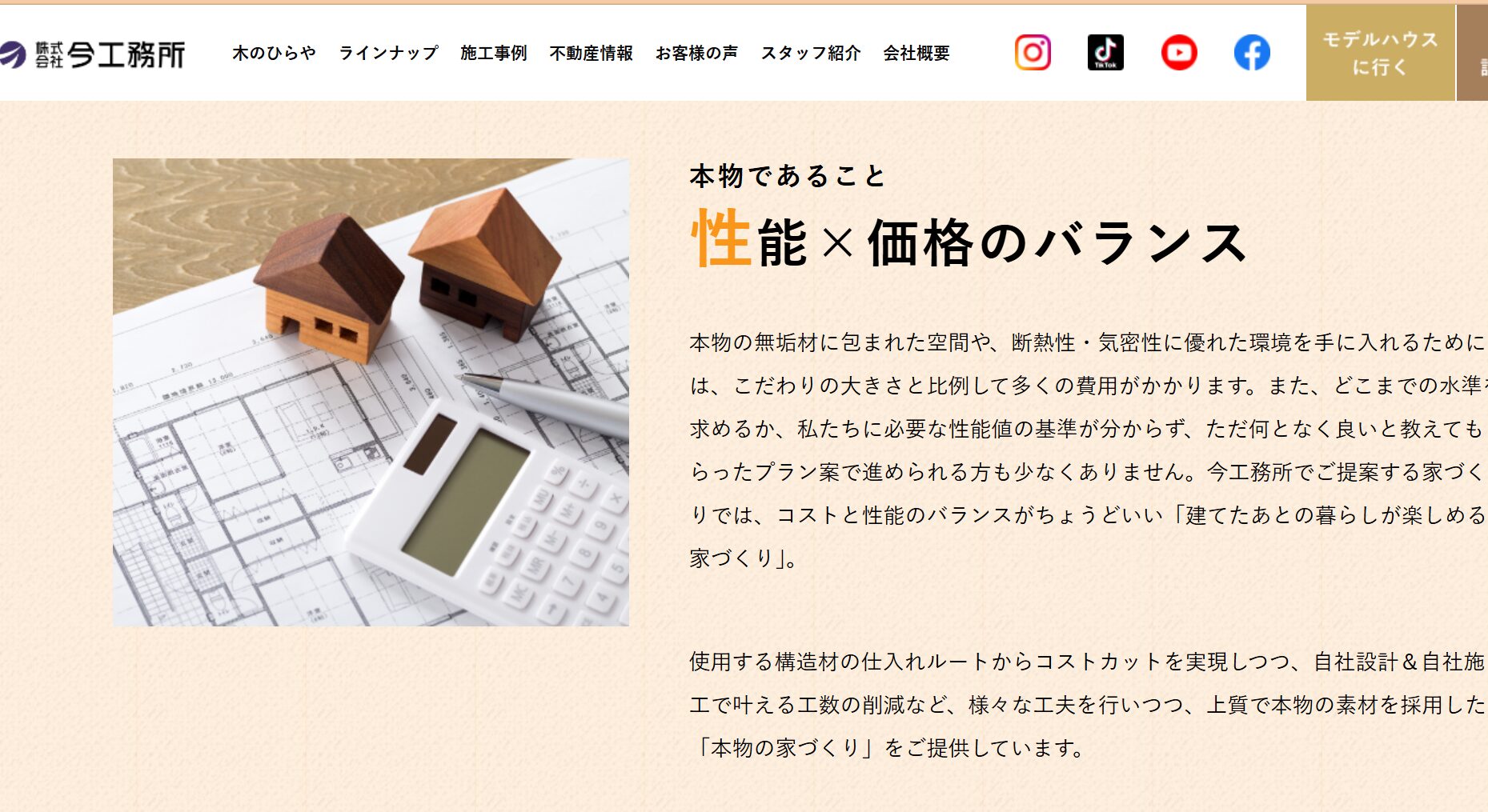 今工務所の商品ラインナップは「40万円台のコスパ重視住宅」から「高断熱・自由設計の高性能住宅」まで幅広く揃っています。