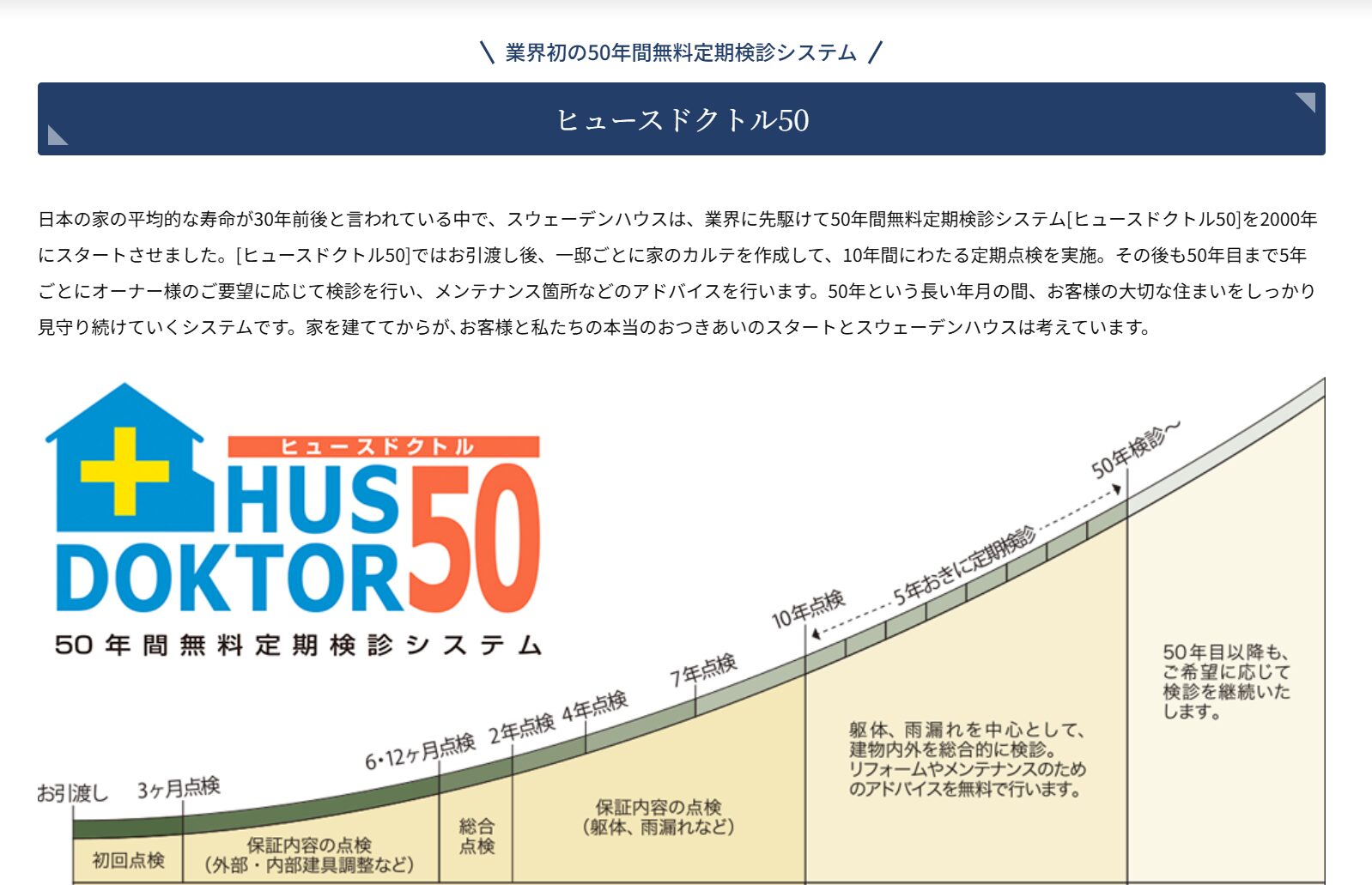 スウェーデンハウスは50年間の無料定期検診制度「永代家守り」を用意しています。