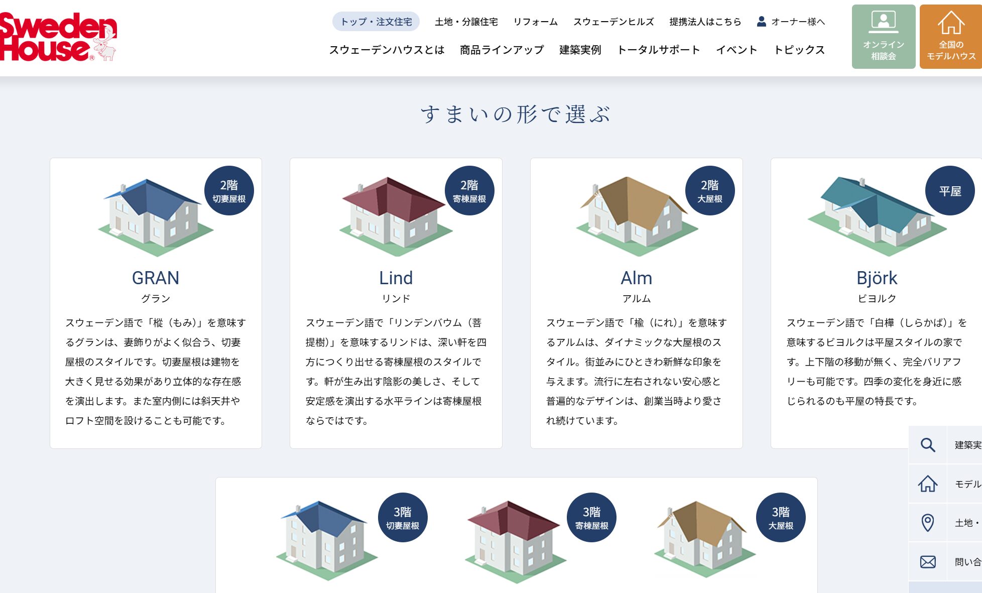 スウェーデンハウスの商品ラインナップは、規格住宅で坪単価を抑えたい層から、完全自由設計で性能を追求したい層まで幅広く対応しています。