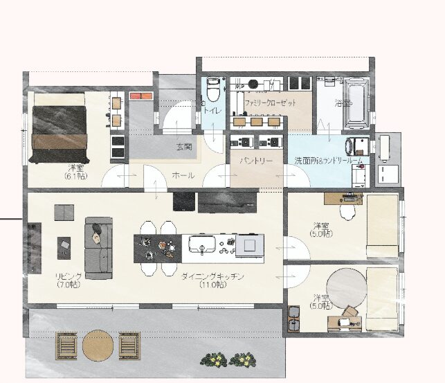 子育て世帯の回遊動線や在宅ワーク用スペースは標準的な対応範囲に含まれます。