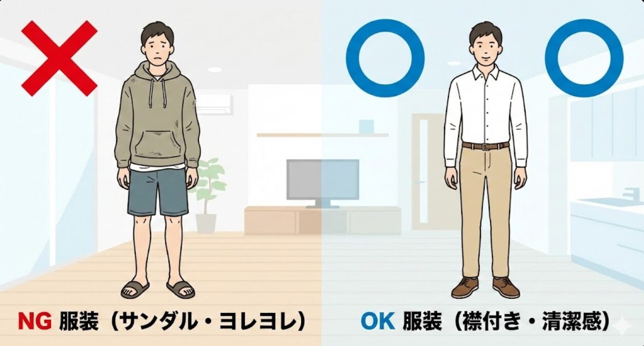 スーツである必要はありませんが、襟付きのシャツなど、最低限の清潔感がある「オフィスカジュアル」なら、営業マンも丁寧に接してくれます。