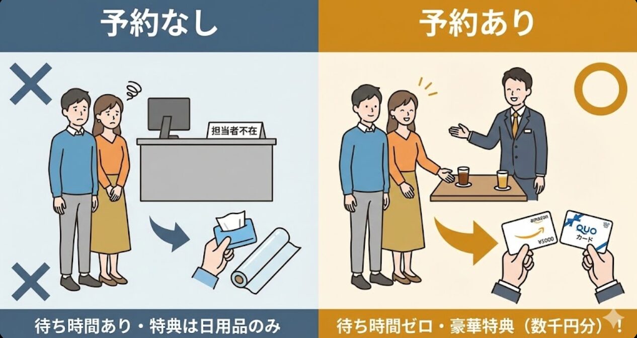 同じ時間を使って見学するなら、予約をして数千円分の特典を貰っておかないと、単純に金銭面でも「損」をしてしまいますよ。