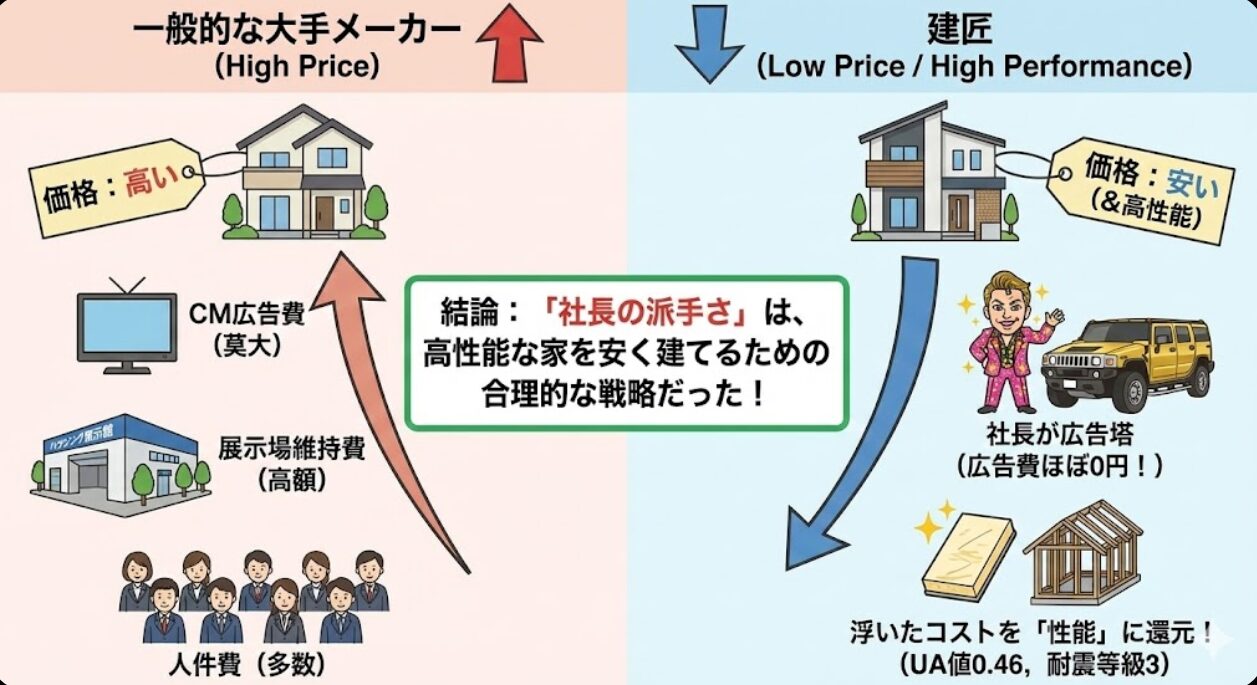 「社長が派手だから怪しい」のではなく、「社長が派手に動いて広告費を浮かせているから、高性能な家を安く提供できている」。