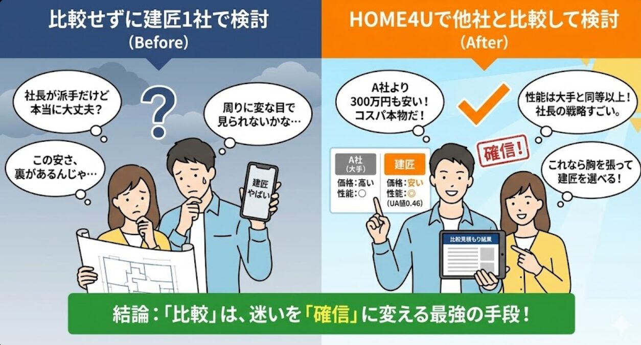大手メーカーの安心料(広告費)にお金を払うか、建匠の実利(性能と価格)にお金を払うか。