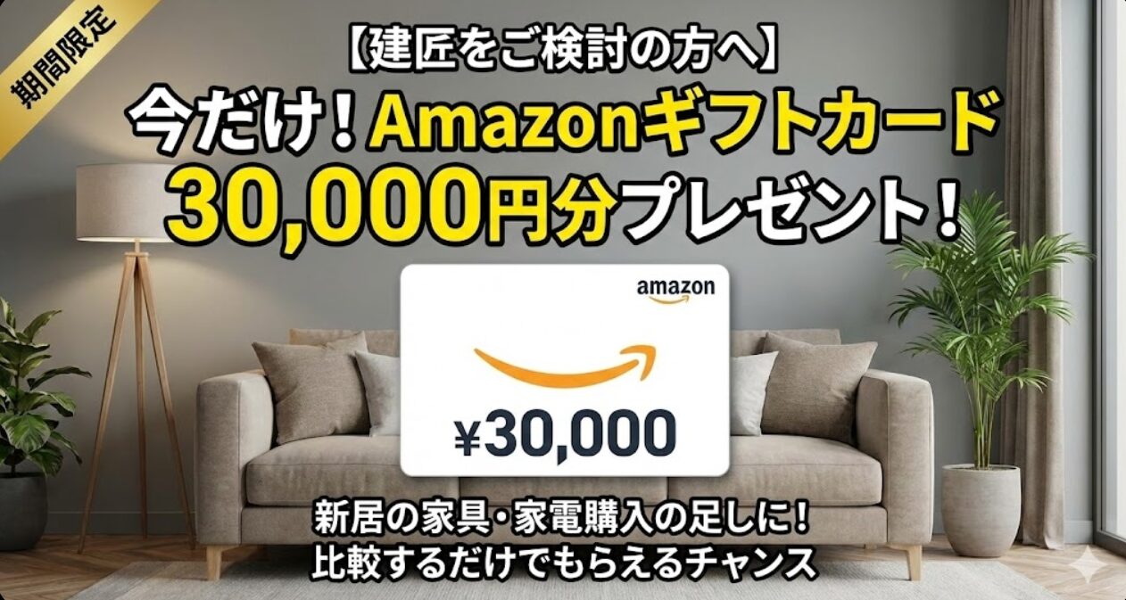 - Amazonギフトカード(3万円分)がもらえる 現在、成約などの条件クリアで3万円分のAmazonギフトカードがもらえます。 比較するだけで、新居の家具や家電代の足しになるなら、やらない手はありません。