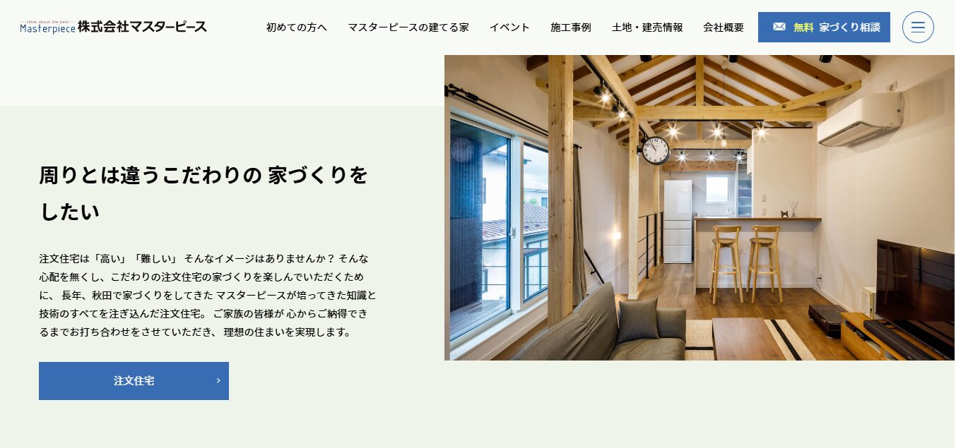 | マスターピース | デザインと性能の両立で人気上昇 | 50〜75万円/坪 | ◎(完全自由設計) | 初期10年+延長可 | 木造軸組・パネル工法 | 秋田県内3か所 |
