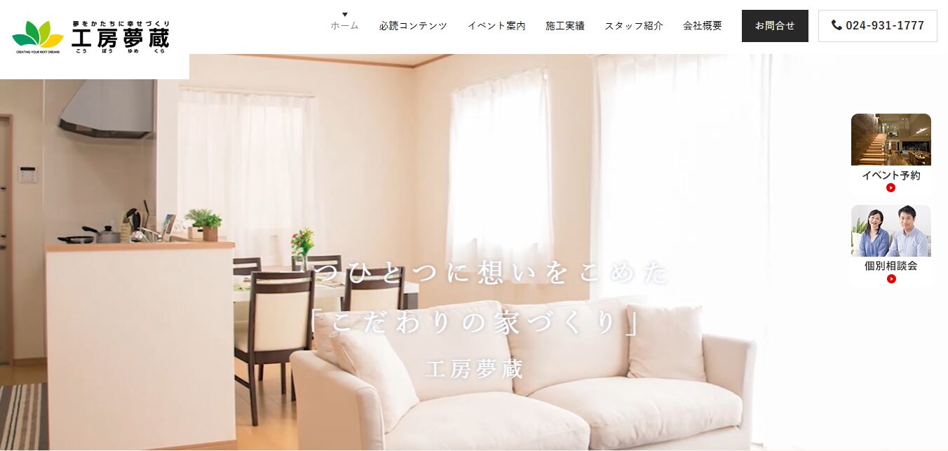 工房夢蔵 | パナソニック工法採用 | 約60〜80万円 | ◎(自由設計) | 初期20年+延長可 | テクノストラクチャー | 1か所 |