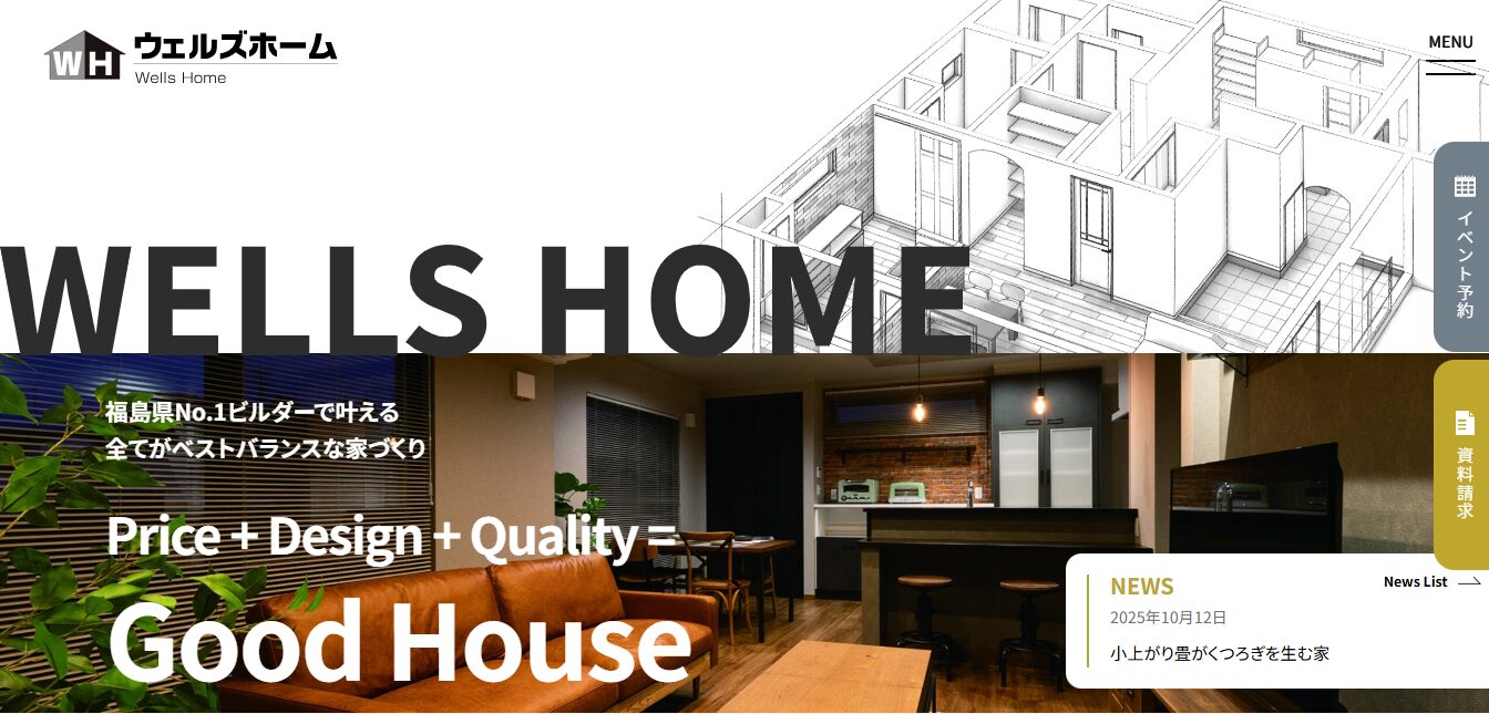 ウェルズホーム | 郡山中心・県内No.1実績 | 約50〜70万円 | ◎(自由設計) | 初期20年+延長可 | 木造軸組 | 4か所以上 |