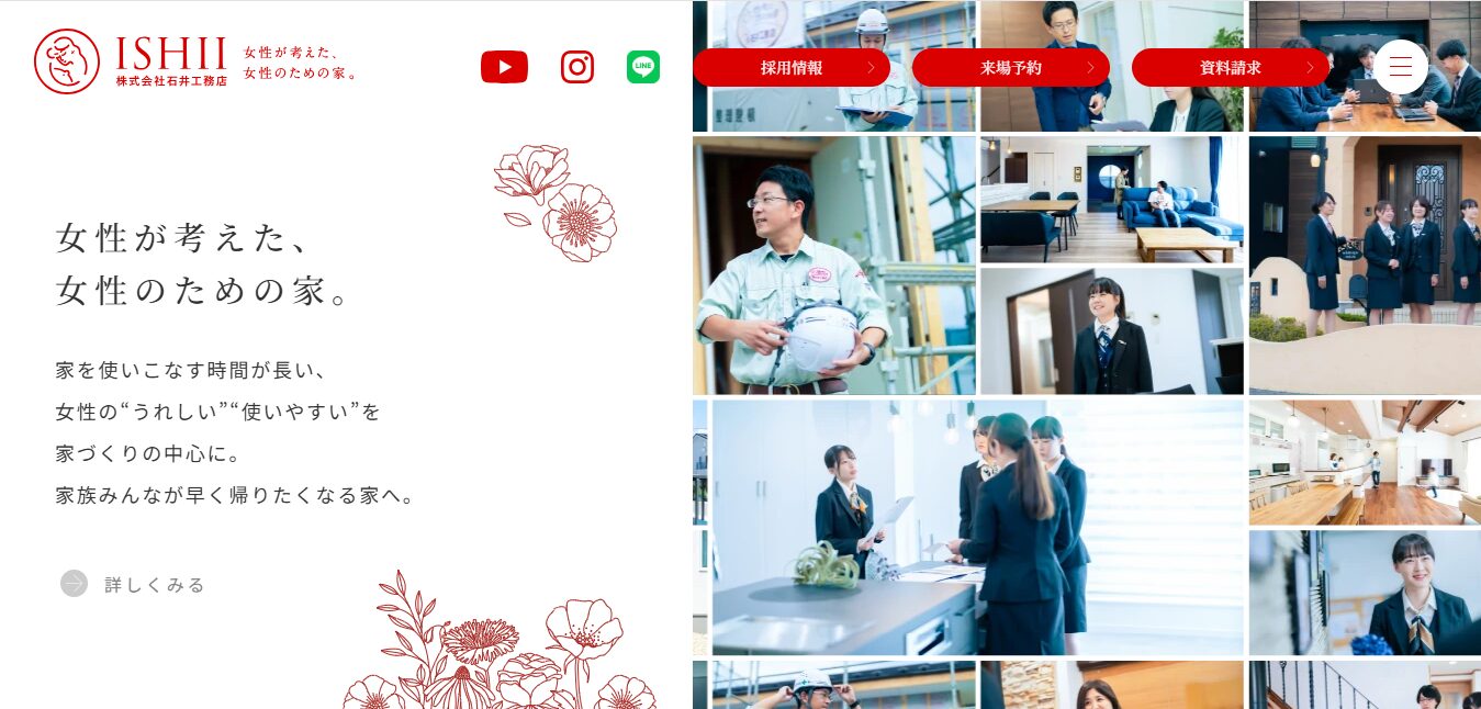 石井工務店 | 女性目線の家づくり提案 | 約60〜75万円 | ◎(完全自由設計) | 初期20年+延長可 | 木造軸組 | 5か所以上 |