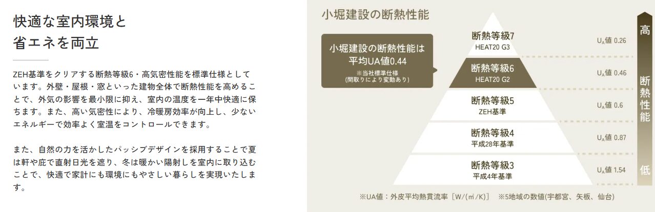 自社生産による部材品質の高さと、HEAT20基準を上回るUA値0.25前後の高性能住宅が魅力です。