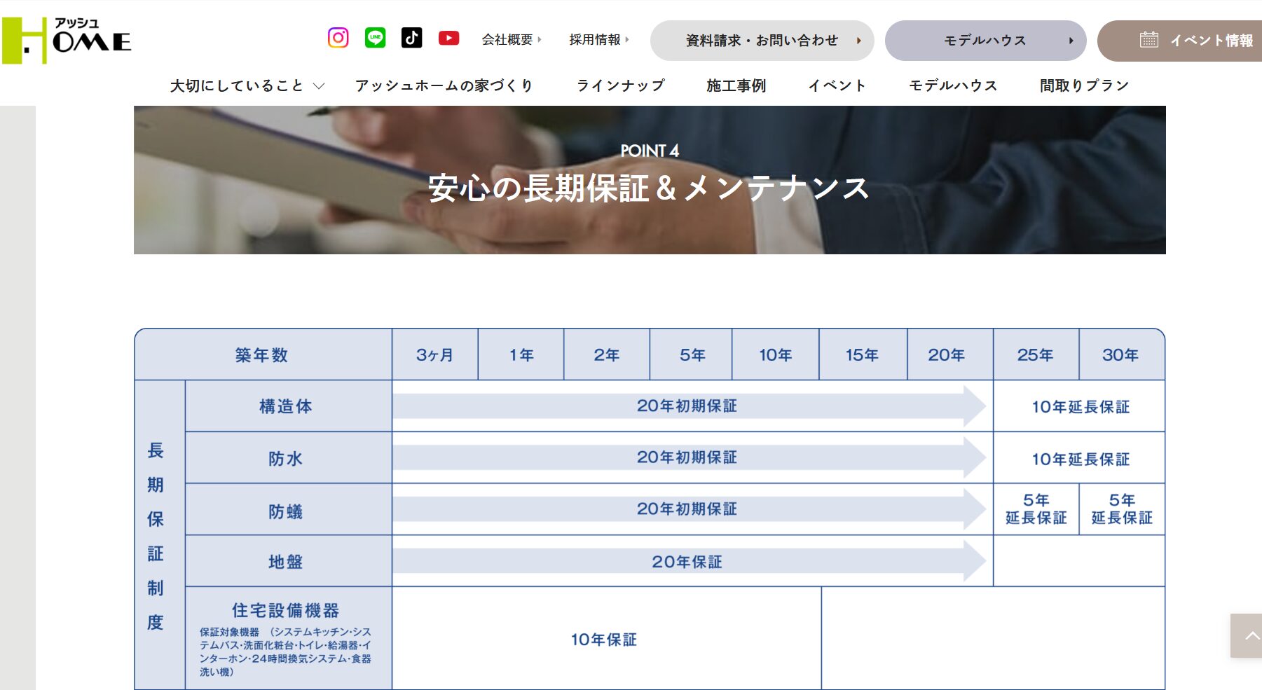 - 構造・防水の基本保証は10年、延長で最長20年まで対応