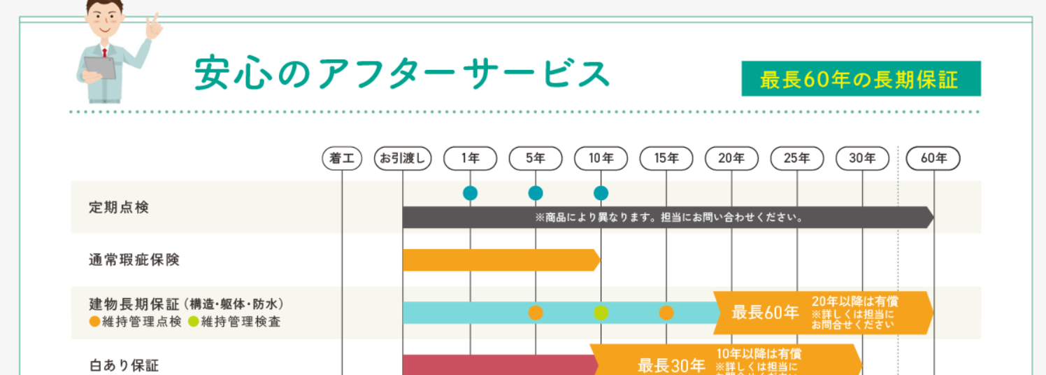構造・防水は最長20年保証、引き渡し後も定期点検制度が整っています。