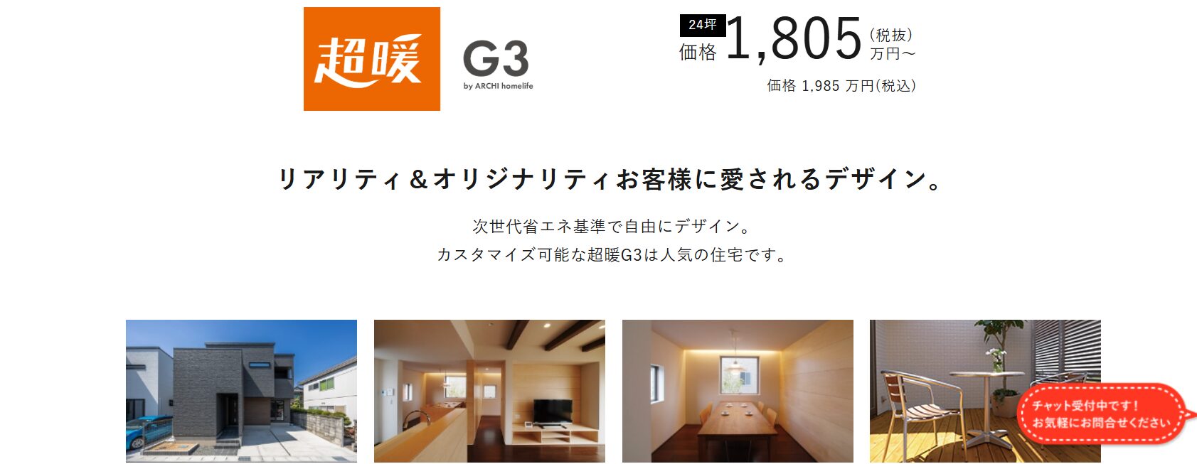 標準仕様でHEAT20 G2レベルの断熱性能を持つ「超暖G3シリーズ」など、快適性を重視したプランが多数あります。