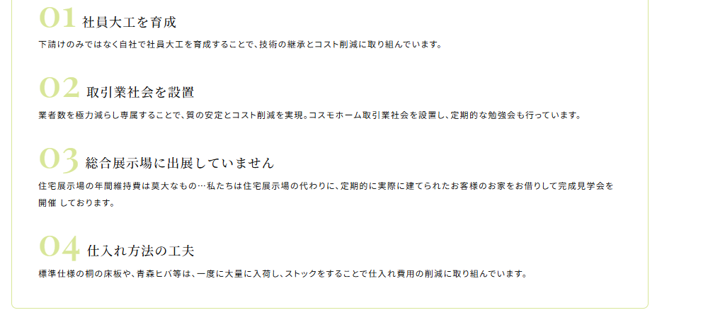 ただし、価格を抑えたい検討者にはコスモホームなどの方が適している可能性があります。
