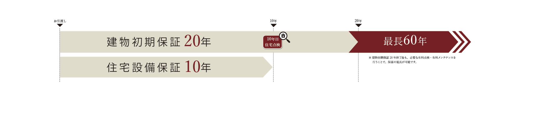 初期保証は20年で、必要に応じて追加保証や有償メンテナンスが可能です。