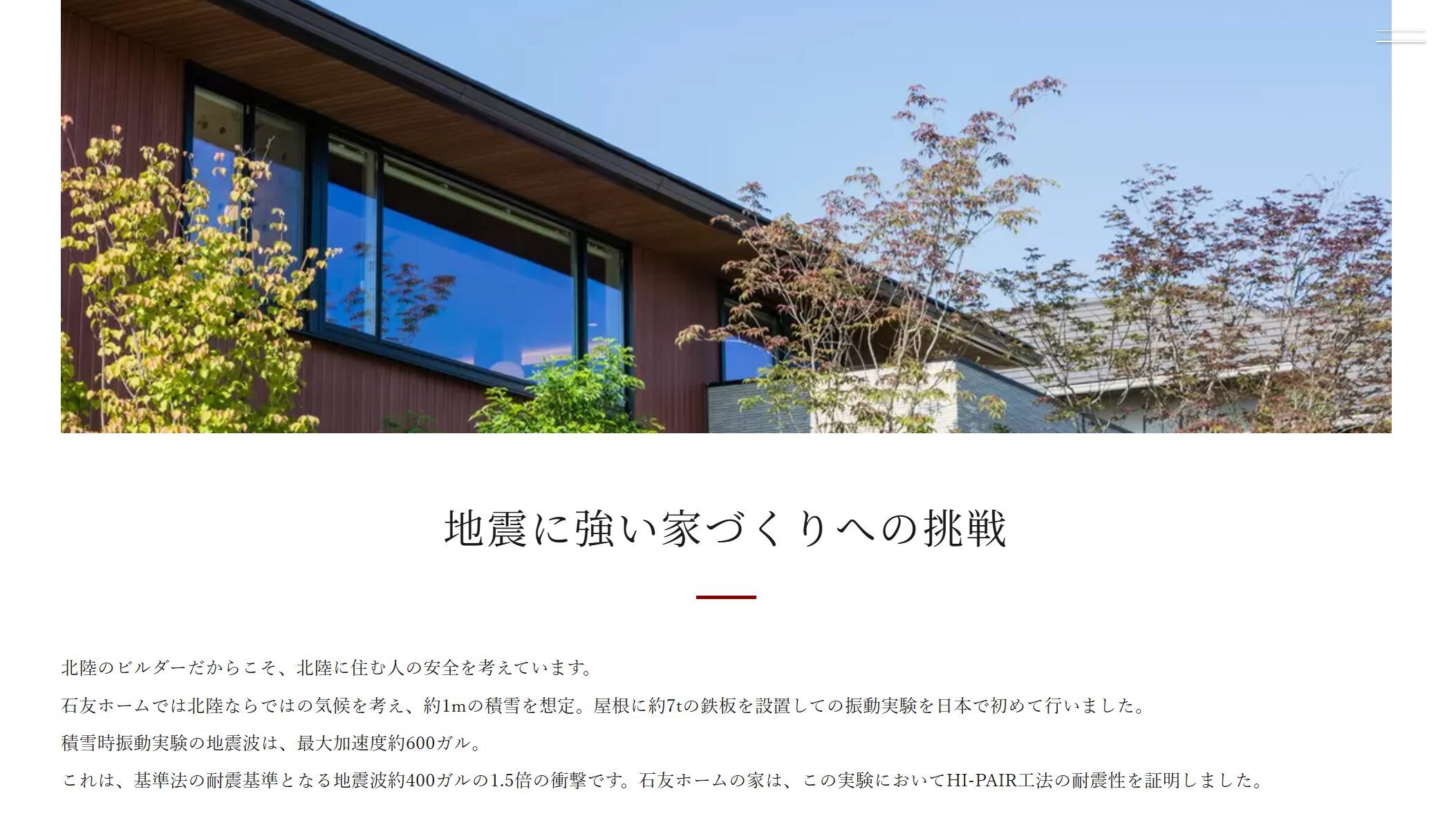 "北陸ブランドの家って言うけど、軸組とパネルを合わせるのは今はどこでもやってる工法だし、制震ダンパーも殆どの会社で取り扱っている。今は石友よりも高気密高断熱仕様のHMや工務店は増えているからね。それにモデルハウスは豪華仕様で全く参考にならなかった。自分は大手と比較した上で、他に決めさせて貰った。特に保証やアフターサービスに関しては大手の方が良かったからね。"