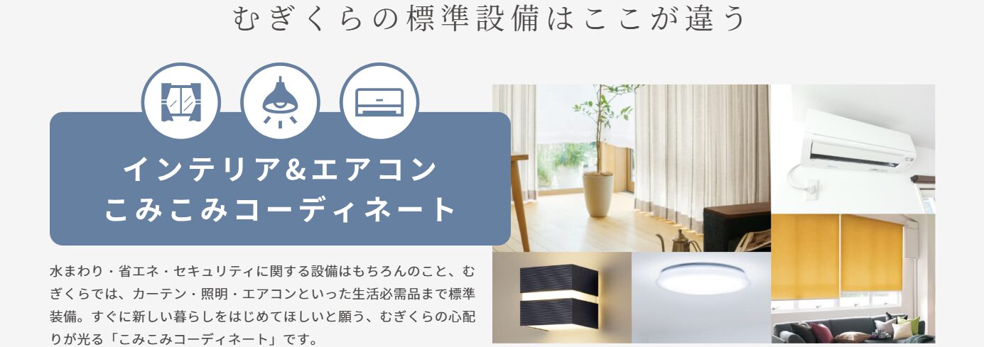 むぎくらでは、エアコンやインテリアなどもコミコミで提供しています。キッチンやバス、洗面台やトイレなども、機能面含めて充実しているのが特徴です。