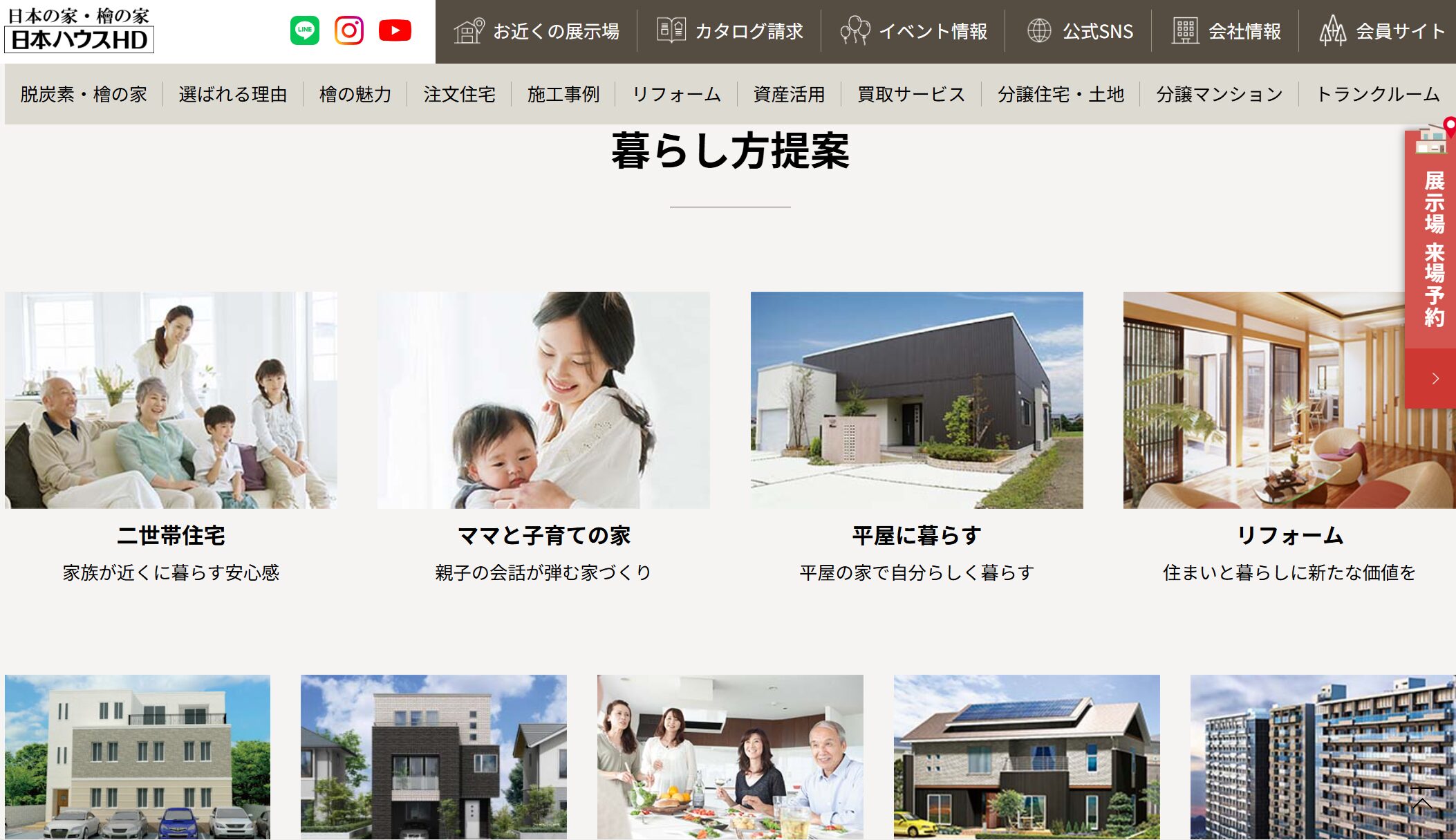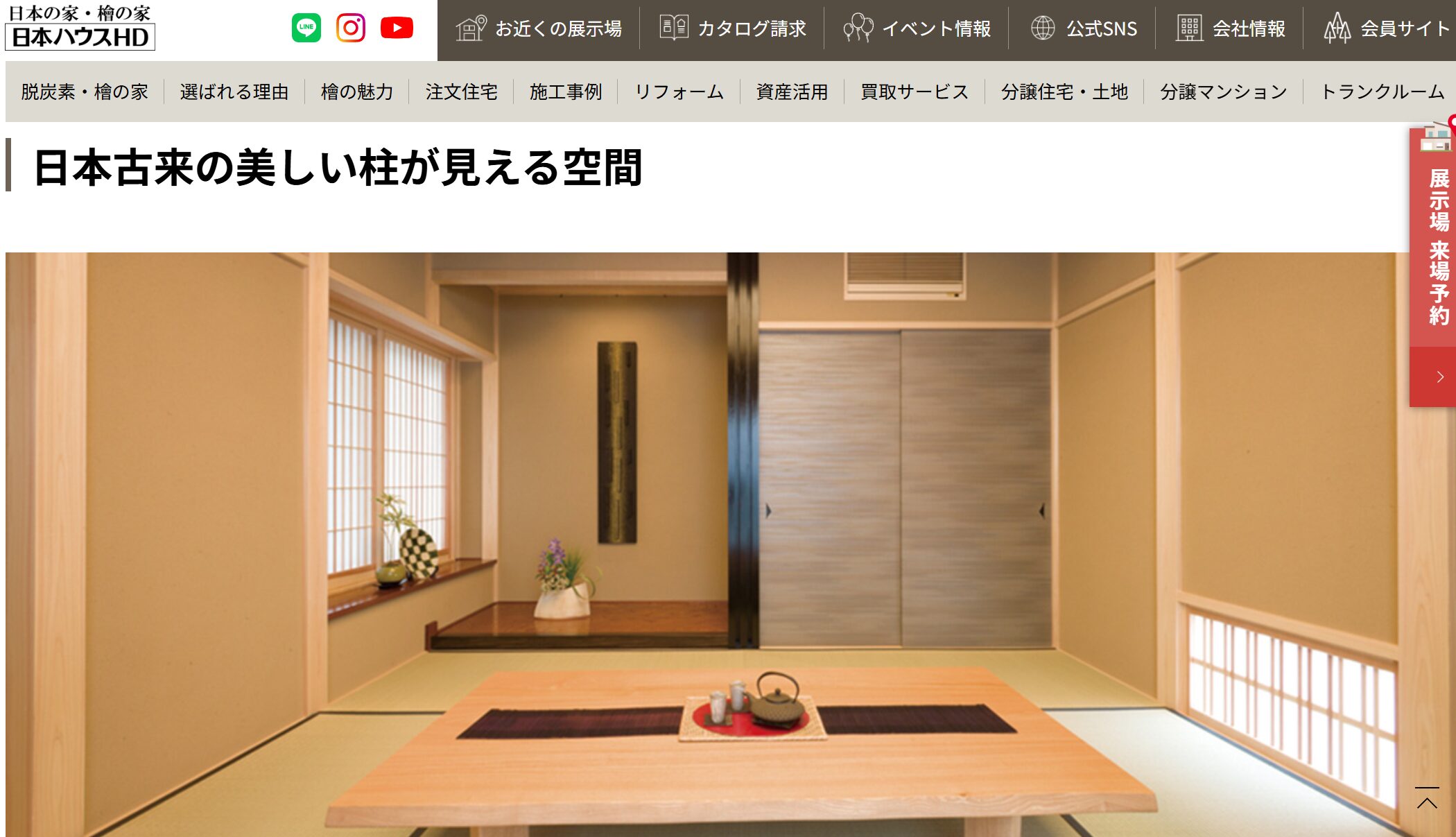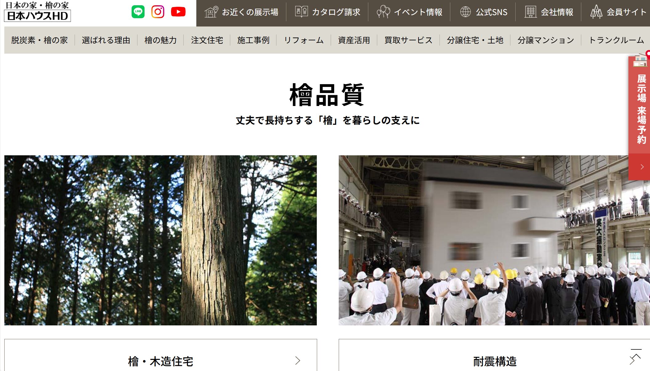 日本ハウスHDは、国産檜100%を構造材に採用した“素材重視”の家づくりが強みです。