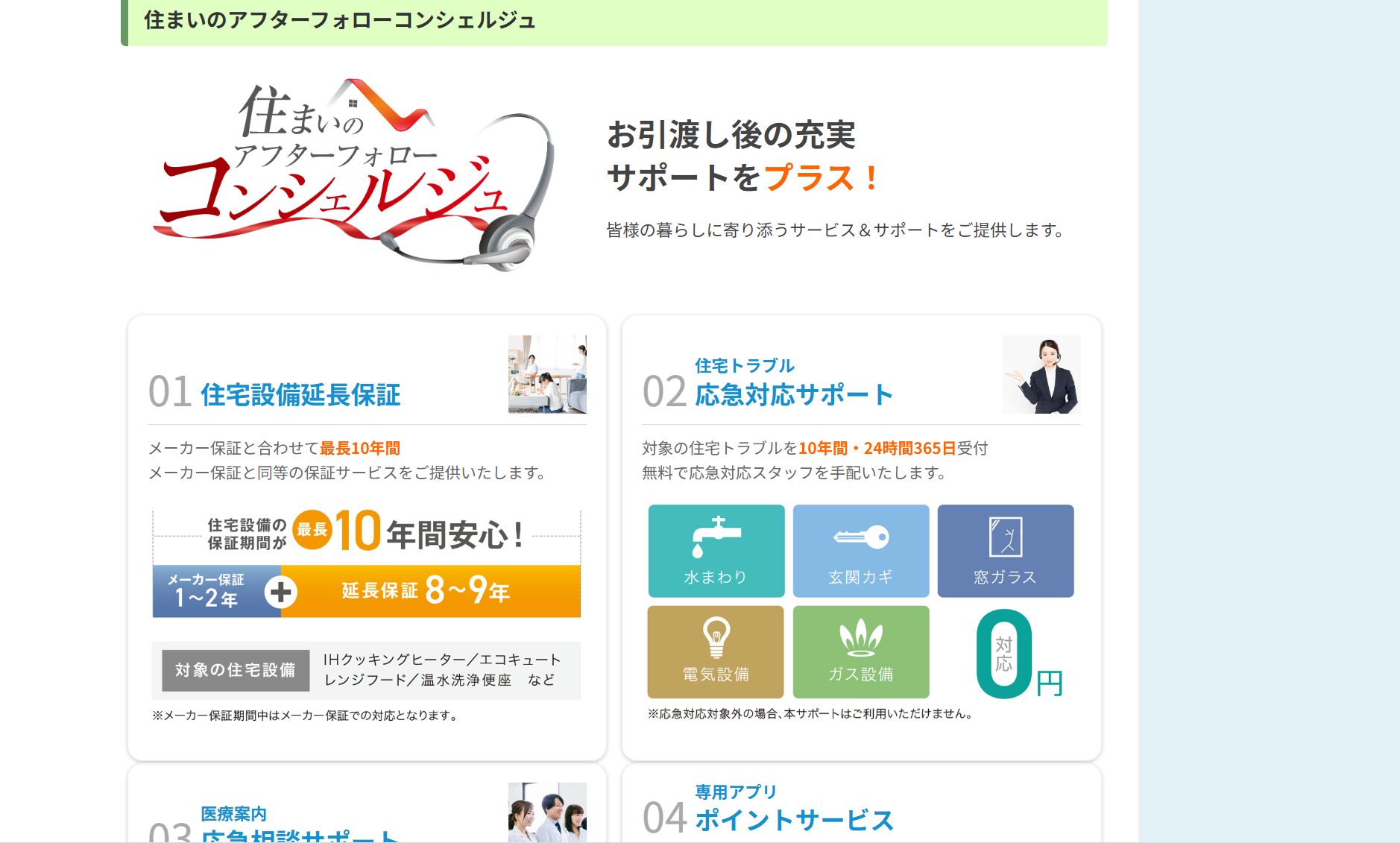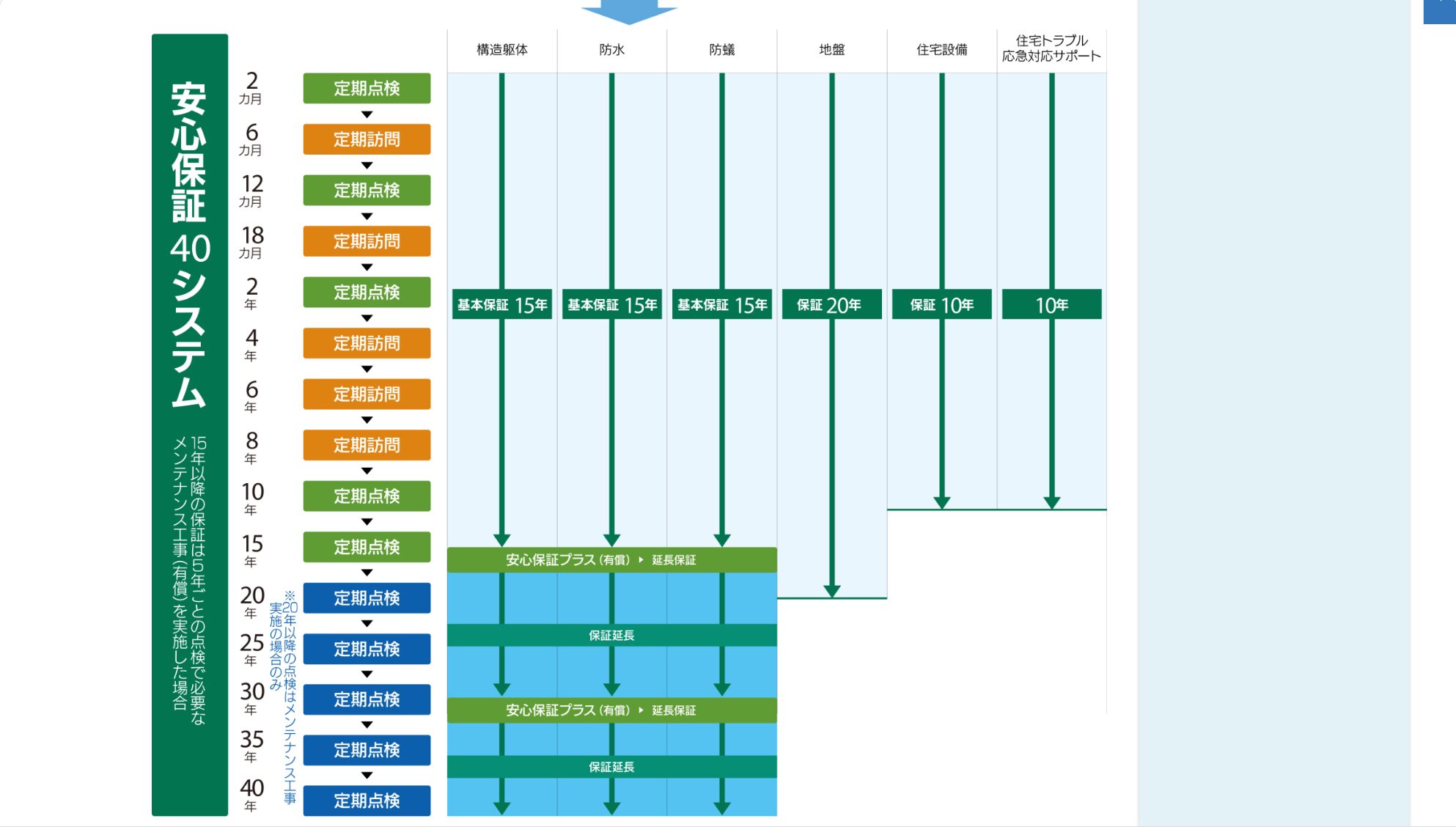 引き渡し後の定期点検があり、構造や雨漏りなど重要部分は長期保証の対象です。