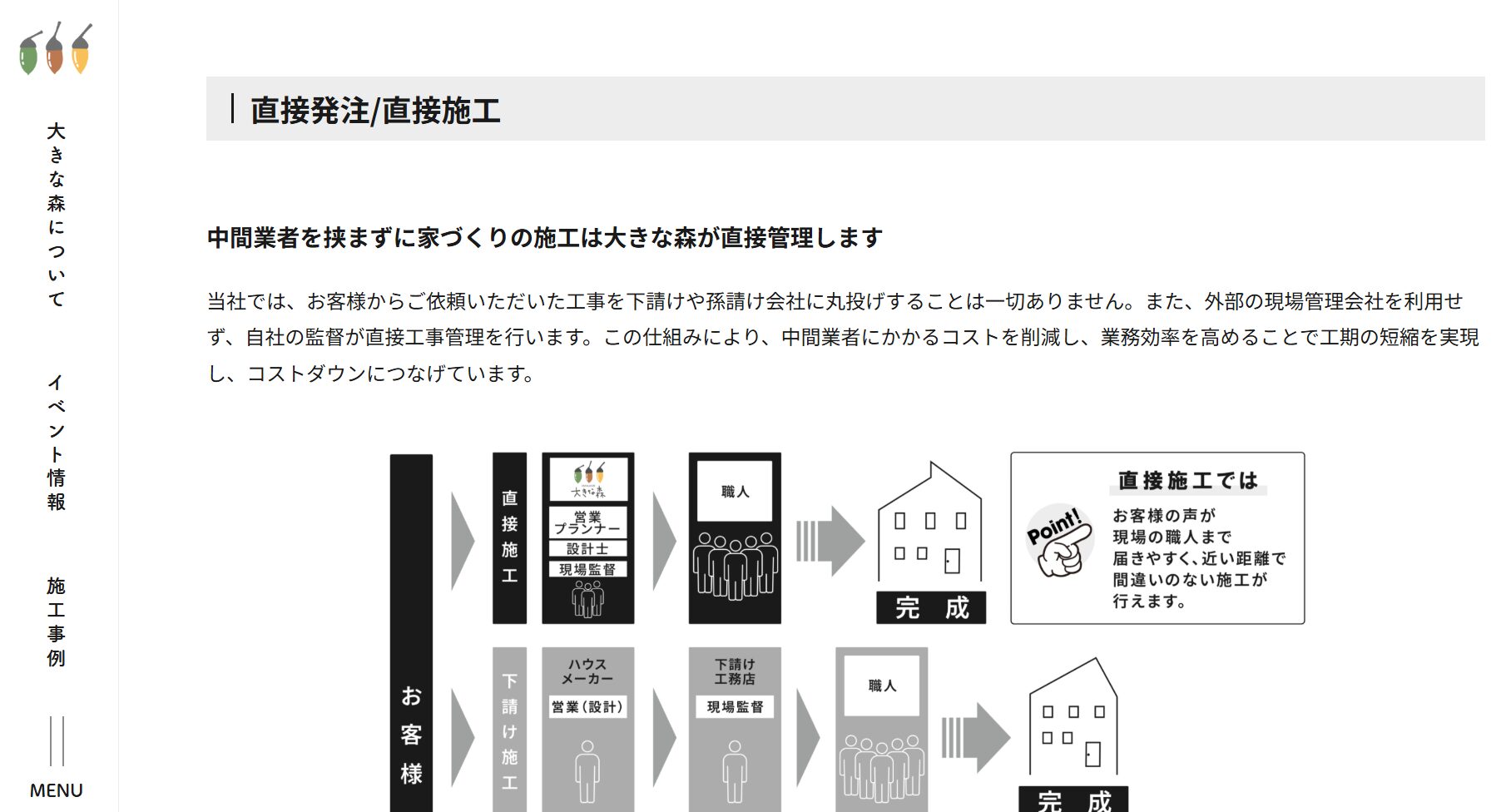 A:大きな森は新潟県中心の地域密着型で、自然素材や適正価格に力を入れている点が特徴です。
