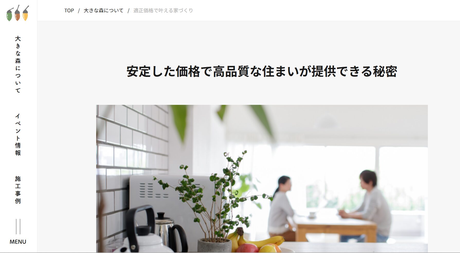 大きな森は「坪単価48〜65万円」という価格帯で、地域密着・自然素材・高気密高断熱を売りにしています。