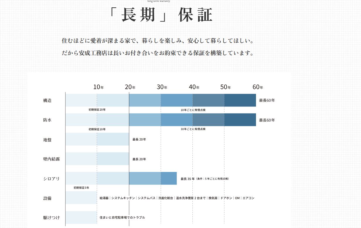 安成工務店では、初期保証10年+地盤保証20年+定期点検制度を備えています。