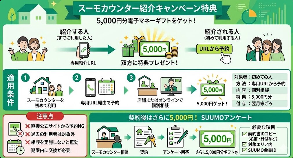 紹介キャンペーンで5000円分ギフト券の特典をもらうには、紹介された専用URLからの予約と、スーモカウンターでの個別相談が必要です。