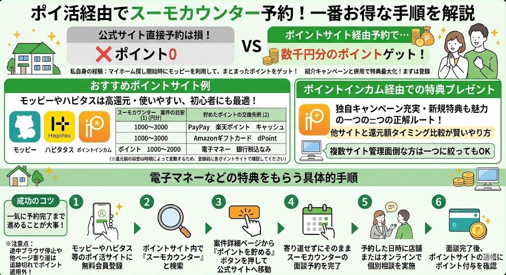 スーモカウンターを利用するなら、ポイ活紹介キャンペーンを併用する手順が、いちばんお得です。
