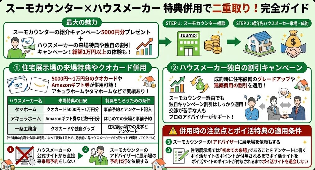 スーモカウンターの紹介キャンペーン、ポイ活サイトの還元、ハウスメーカー独自の割引や来場特典のクオカード、SUUMOアンケートは、すべて併用可能です。