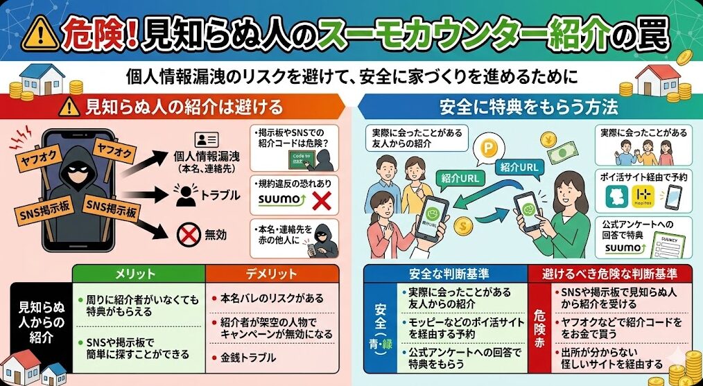 スーモカウンターの紹介キャンペーンを利用する際、見知らぬ人から紹介を受けるのは、個人情報漏洩の危険があるためおすすめしません。