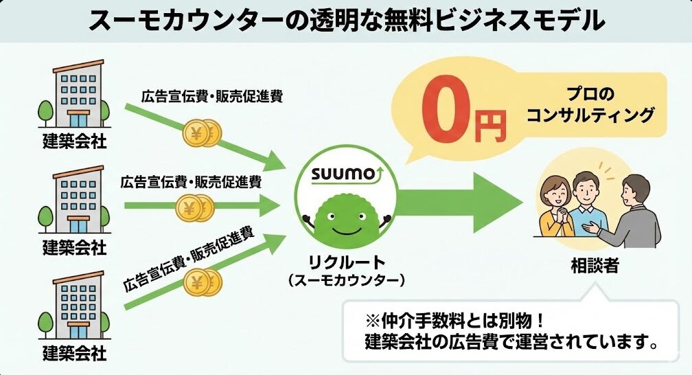 スーモカウンターの利用を検討する際、「これほど手厚いサービスがなぜ無料なのか?」と不安に思うのは自然なことです。