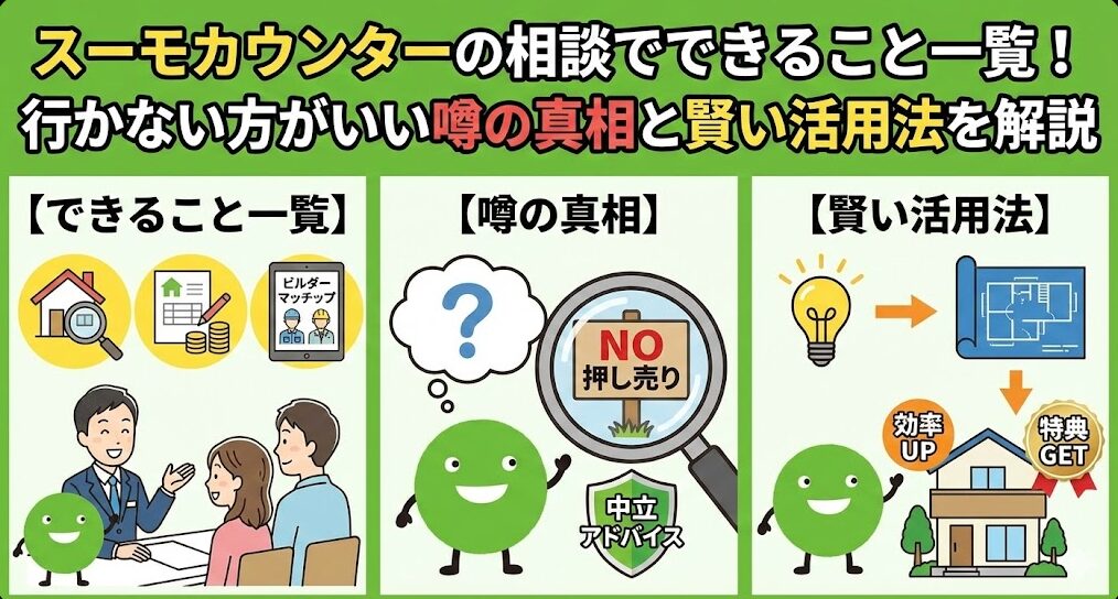 この記事では、スーモカウンターで具体的に相談できることの全容と、ネット上のネガティブな噂の真相、そして「住宅展示場に行く前に使うべき」決定的な理由をわかりやすく解説します。