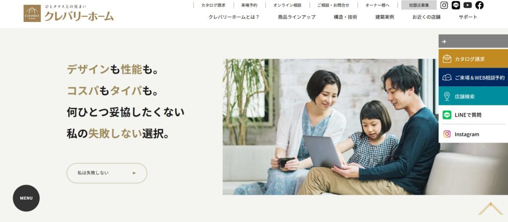 クレバリーホーム | タイル外壁で長持ち | 50万~70万円 | ◯ プラン調整可 | 初期30年+延長可 | 木造軸組 | 福井県内2か所以上 |